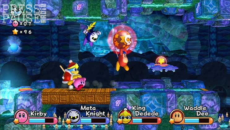 The available characters are uniquely varied with the option of either choosing King Dedede, Meta-Knight, or Waddle-Dee, or being an additional Kirby, which creates a dynamic that also translates really well into having the charm of playability with anyone. So how does this work exactly? The non-Kirby characters resemble permanent representations of Kirby powers. King Dedede would be the hammer, Meta-Knight being the sword, and Waddle-Dee being the new spear power (more on that later), but they also have their own attributes as well. Dedede is slower but can take the most damage, Meta-kinght is the quickest in his maneuvers, and Waddle-dee has the most varied weapon. Kirby also possess a super suck ability that’s activated when shaking the Wiimote up and down, which takes out multiple objects as well as specific objects that can only be taken out by this tactic, and it's integral in certain points progression (implying that if there’s only one veteran player in your group that they should take the mantle of Kirby.) with your friends choosing to be one of non-kirby characters, the advantages of have their Hammer and Sword power-ups can make stage exploration much easier. These abilities can both be used underwater, along with unlocking certain secrets (the Kirby equivalent of interacting with contextual set-pieces) that eliminate a lot of the challenge of needing to do any heavy resource management for circumstantial powers that Kirby would normally need to obtain to tackle any stage secrets. For those experienced players chomping at the bit for a challenge, going with a full-Kirby set of players adds the element of smart resource management and communication that hasn’t been done this well since Castle Crashers.