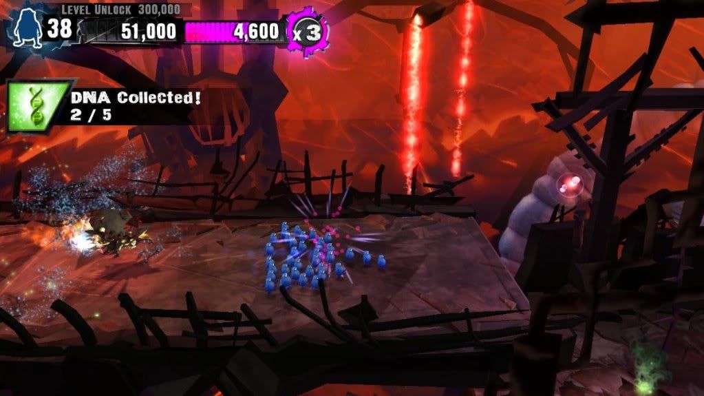 As I mentioned before, your swarm needs to collect spirits, but in order to smash open these objects or work towards obtaining these precious spirits, the brutal splattering of your blue goonie tribe is exacted to meet your reluctant goal. The game will continue to go on even despite the violent expiration of your wretched brethren as long as one remains. With this one lone creature, your goal is to survive long enough to reach the next Swarm nest where you can repopulate back to 50 and navigate to the end of the level with your objective accomplished. The score from the purple spirits, if collected through a continuous chain, build a level of score and multipliers. The more spirits you collect and longer you keep it up, the more score you can get all while keeping your swarm somewhat alive and ready to conquer through the land ahead.
